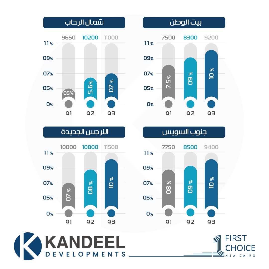 ومن الاسباب التي ادت الى زيادة الاسعار في مشاريعنا في القاهرة الجديدة و ارتفاع قيمة الاستثمار بعا هي تمسكنا بتقديم نفس الجودة واستخدام افضل الخامات لتنفيذ افضل منتج عقاري مقابل اعلى قيمة كما وعدنا عملاءنا. لتظل مشاريع قنديل الاكثر تميزا في القاهرة الجديدة والاكثر التزاما بتقديم افضل قيمة مقابل السعر.